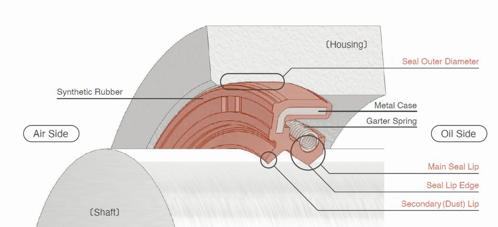 A typical oil seal consists of synthetic rubber, a metal case, and a spring. Oil seal basically has 2 lips, main and dust lip. The main lip seal fluid to contact the rotation shaft. The dust lip prevent penetration of the contamination from outside. The spring supports to increase and maintain the radial force.